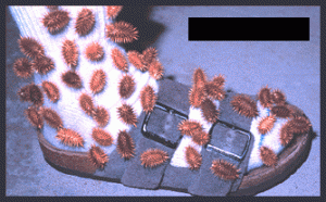 1 and his dog went on a hunting expedition and 2 stuck to his foot in a way similar to 3. What did 1 invent after looking at this?