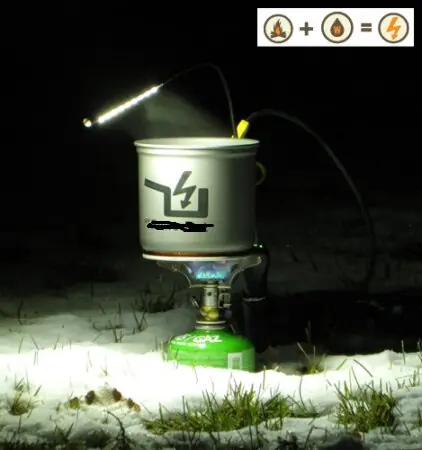 This post has a thermocouple. The botton is heated and the top is cooled by water. Generating electricity.