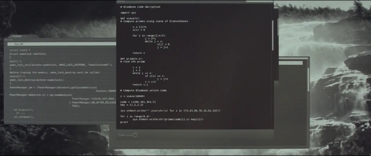 Ex_Machina. When you run that code which appeared on screen in Ex_Machina, you will get an ISBN, which happens to be the ISBN of the book “Embodiment and the inner life: Cognition and Consciousness in the Space of Possible Minds”